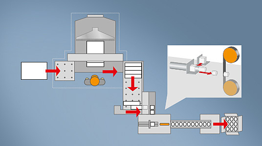 Zuerst wird das Etikettenmaterial mit einem POLAR Schnellschneider inline oder offline als Streifen vorgeschnitten. Der Schneidautomat POLAR Autocut 25 übernimmt anschließend die Streifen und schneidet diese zu Nutzenpaketen. Eine Ausschiebevorrichtung am Vordertisch des Autocut 25 transportiert das Nutzenpaket zur Systemstanze DC.